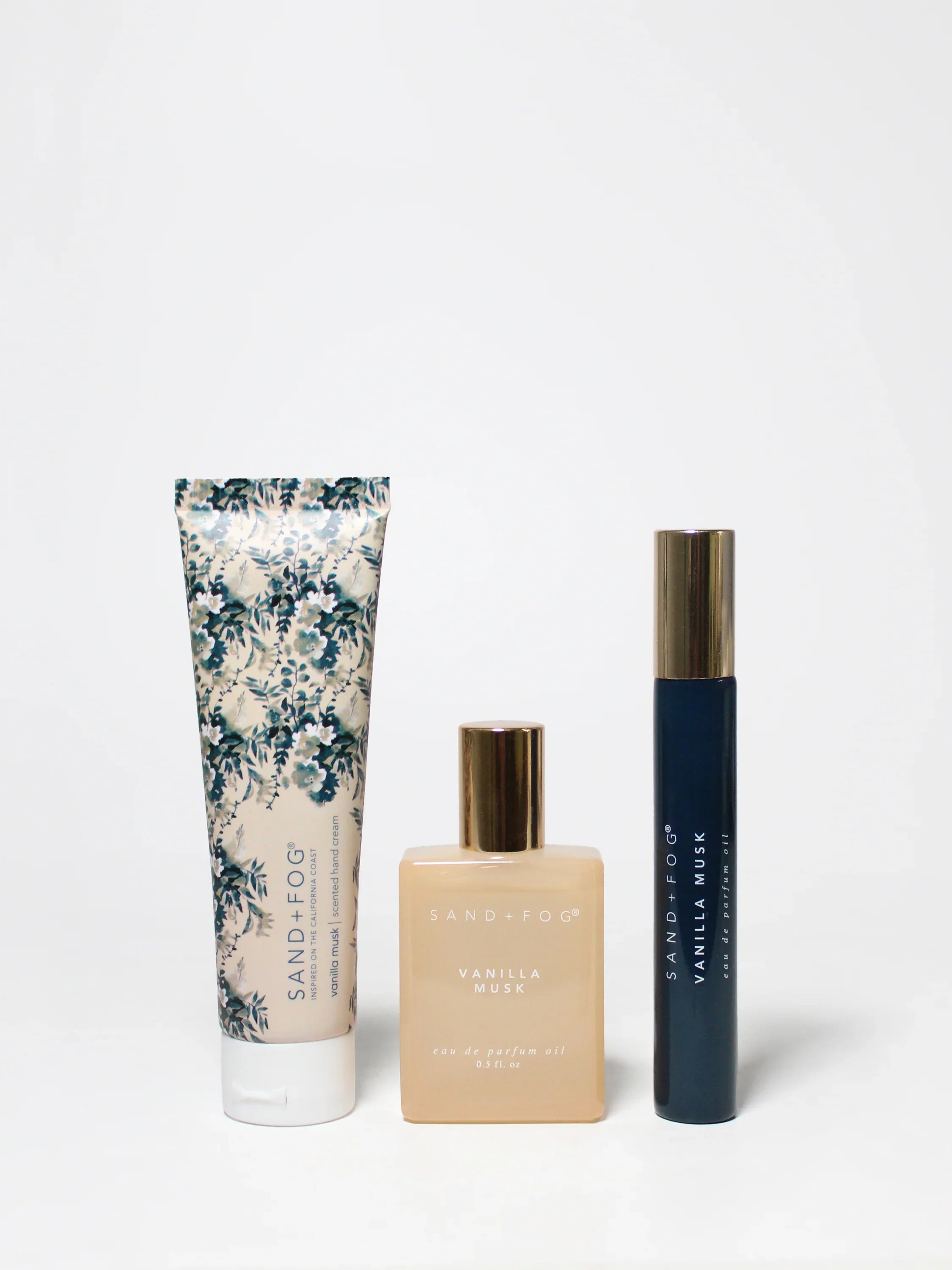 Experience the warm, inviting embrace of our Vanilla Musk scent with this luxurious set. Featuring a 10ml travel perfume oil, a 15ml perfume oil, and a 30ml hand cream, this collection envelops you in a soft blend of creamy vanilla and warm musk. The alcohol-free perfume oils and rich, nourishing hand cream are sulfate, formaldehyde, paraben, and cruelty free, offering a clean, comforting fragrance that lasts all day. Indulge in the ultimate vanilla experience with every use. Elevate your everyday moments with this luxurious perfume oil and hand cream set, available exclusively from Sand + Fog.